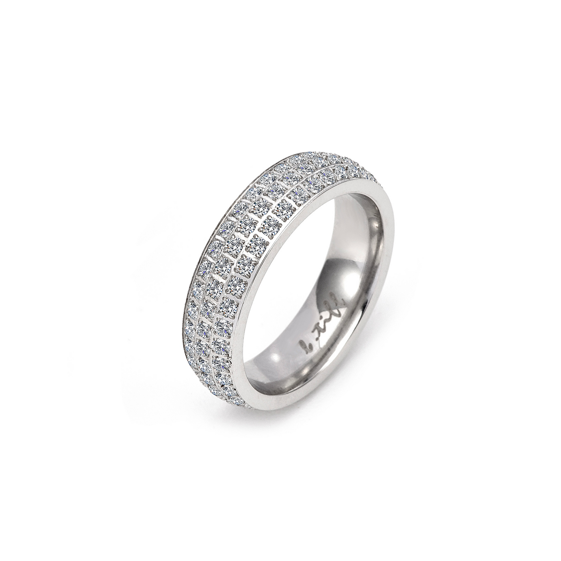 Covered head to toe in three rows of brilliant .01 ct B.Tiff Diamond Alternative stones, over 100 stones are here to dazzle you and whoever your lucky date is tonight. If you’re looking for some extra adoration, then this ring will do it. The stones are set in our hypoallergenic, surgical stainless steel. Choose between dazzling silver or always attractive gold.