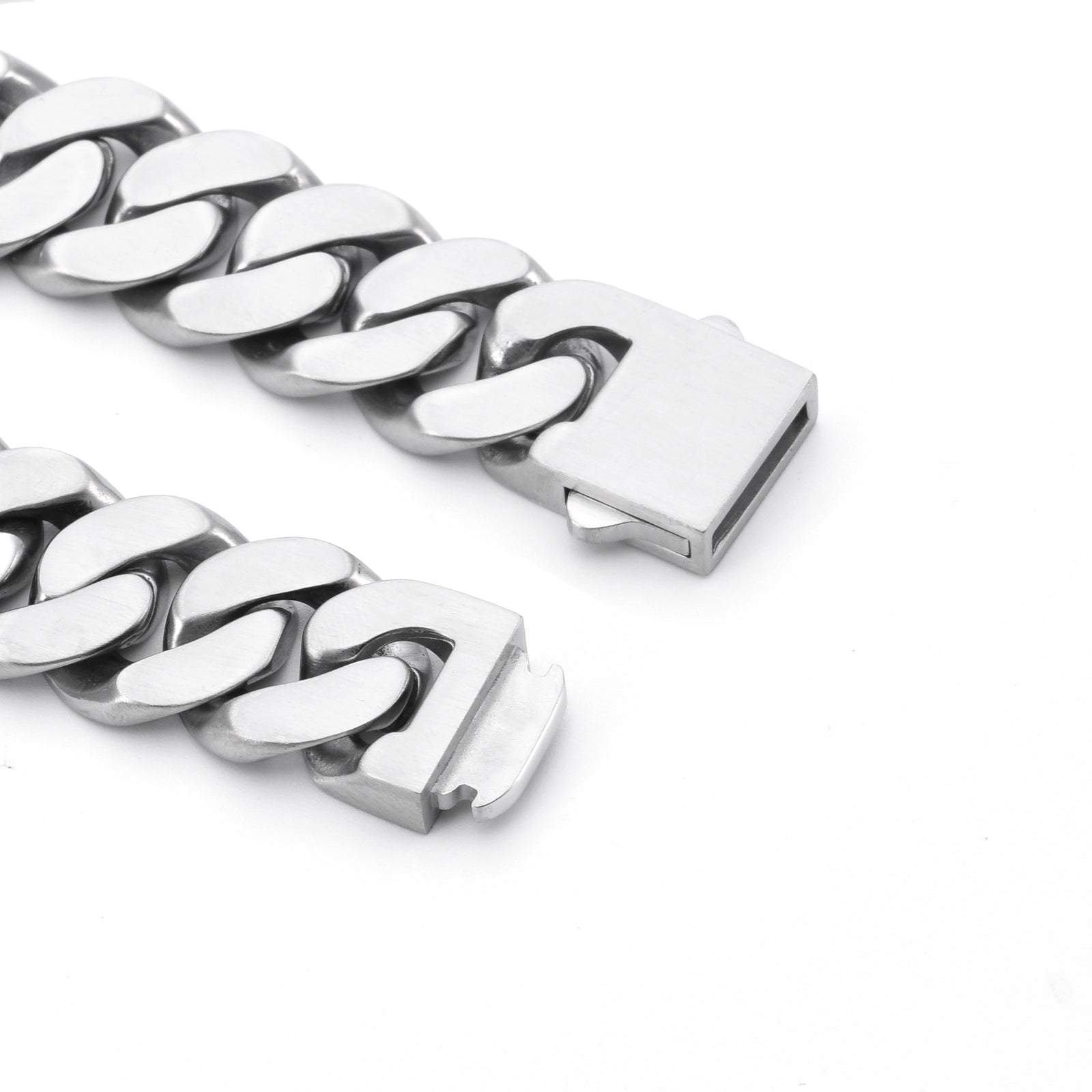 The New Bold Flat Cuban Link Necklace is one of the boldest cuban chains out right now. Our B.Tiff Cuban Link Necklace uses large links to craft a lovely texture that easily accentuates you as a person along with any other pieces that you're wearing along with it. You'll find that B.Tiff's necklaces are made only from high-quality stainless steel that is soft on the skin, nickel-free and resistant to any dimming or tarnishing. This heavyweight solid cuban link is available in the gold tone with a triple lock clasp to keep chain securely around your neck, this is a necklace built to last for many years to come.