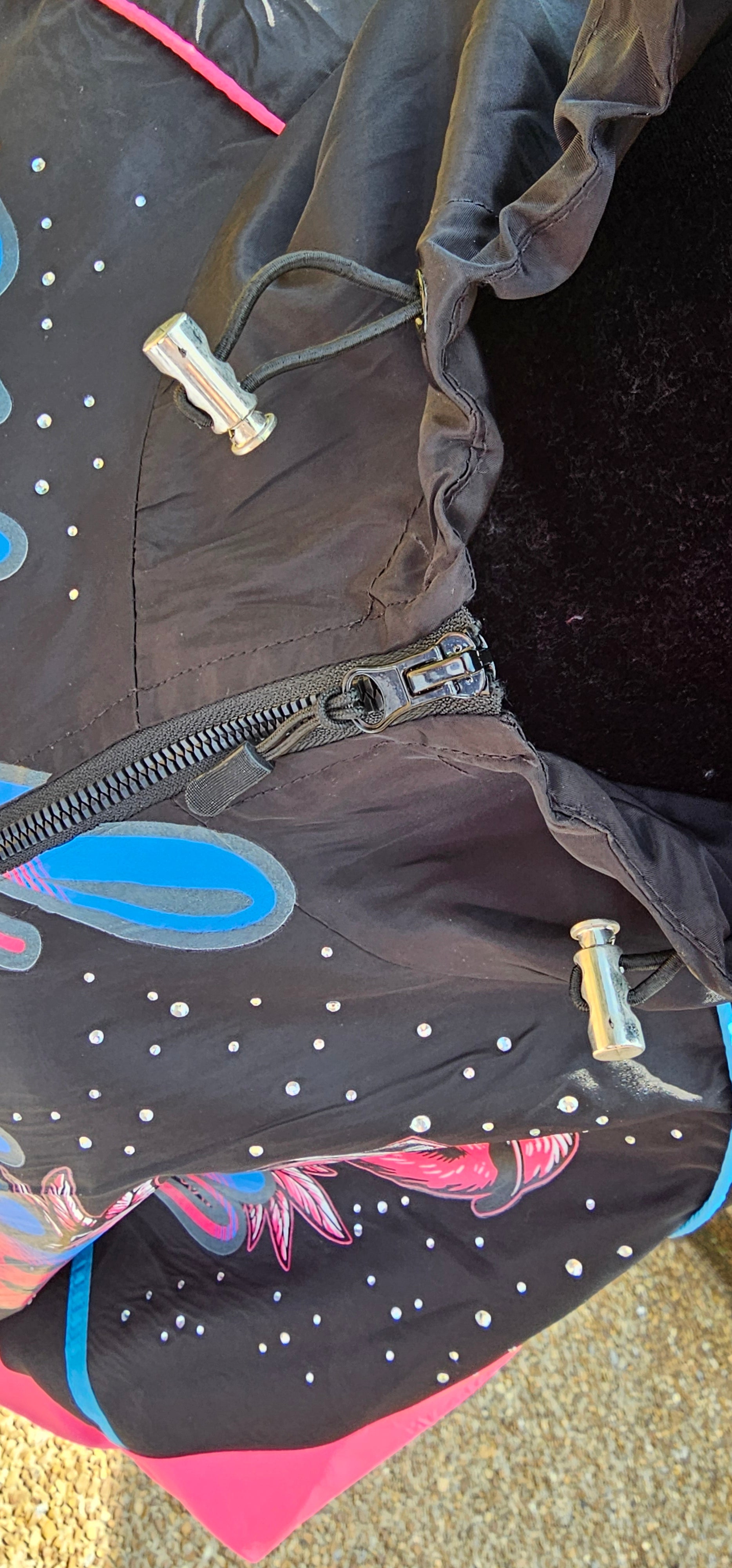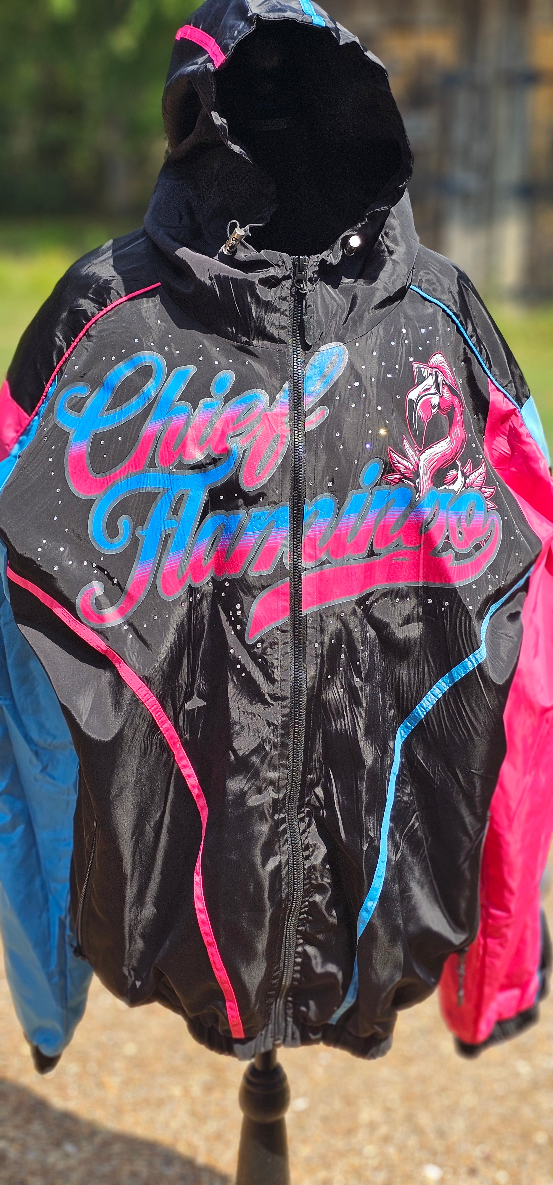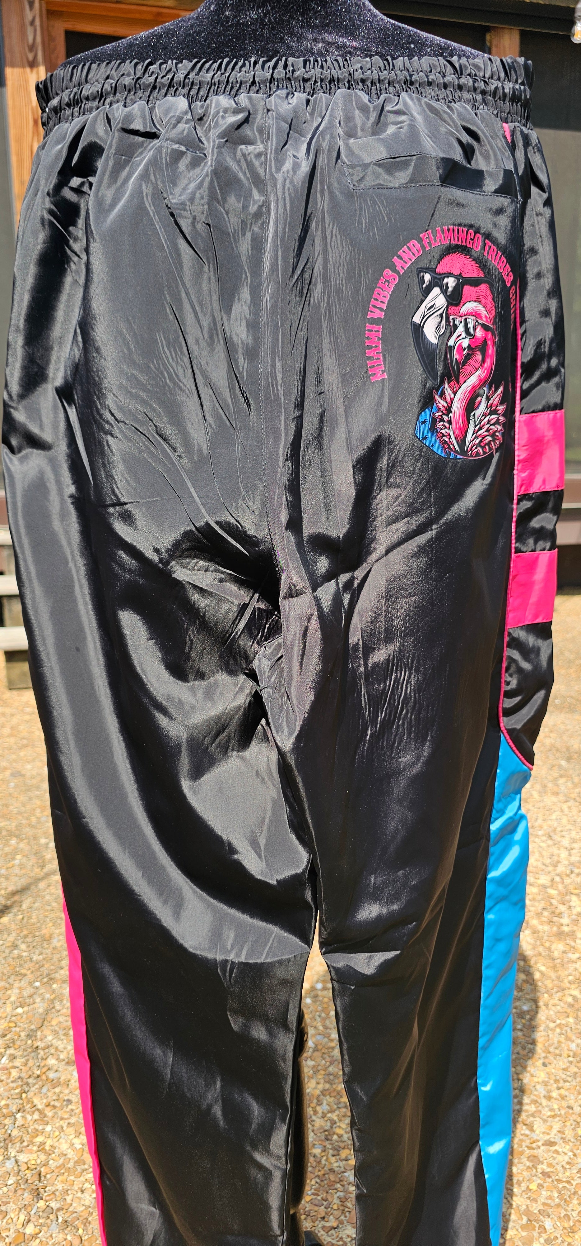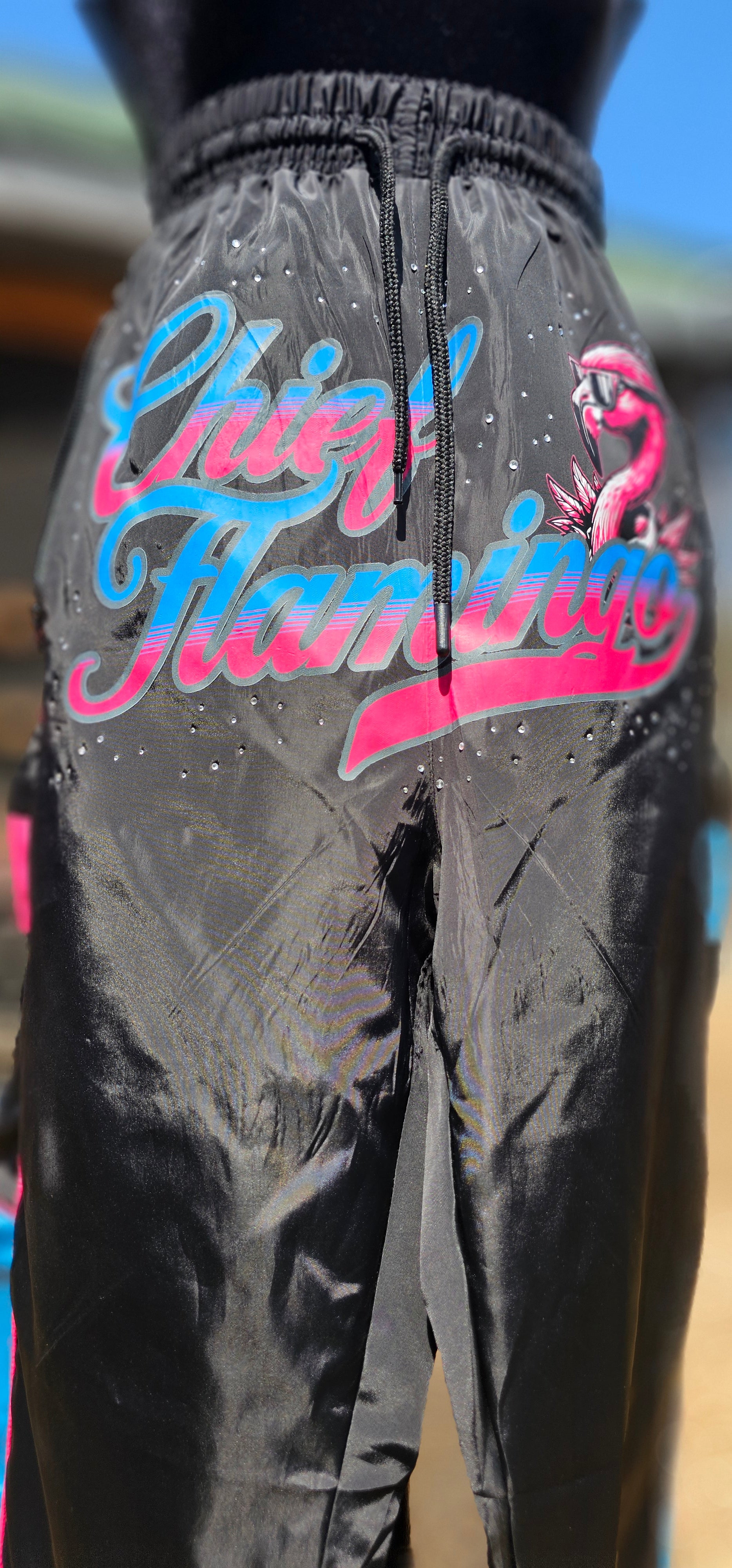 Yo, step up your game with the Chief Flamingo Jogger Suit—straight fire for the Brooklyn hustlers reppin' that island-to-streets fusion. This XL set's got you covered head-to-toe: comfy drawstring pants with elastic cuffs for that effortless mobility, matchin' hoodie with a kangaroo pocket to stash your essentials, and a full-zip vibe for easy layering on those crisp BK nights. The artwork? It's droppin' two fly pink flamingos rockin' shades, poppin' off against a straight-up bold black backdrop that amps up their boss energy. Curved text hits hard with "MAUI VIBES AND FLAMINGOS TRIBE," mixin' tropical island swag with raw Brooklyn streetwear grit—talkin' crew loyalty, self-expression, and that unbreakable block spirit.