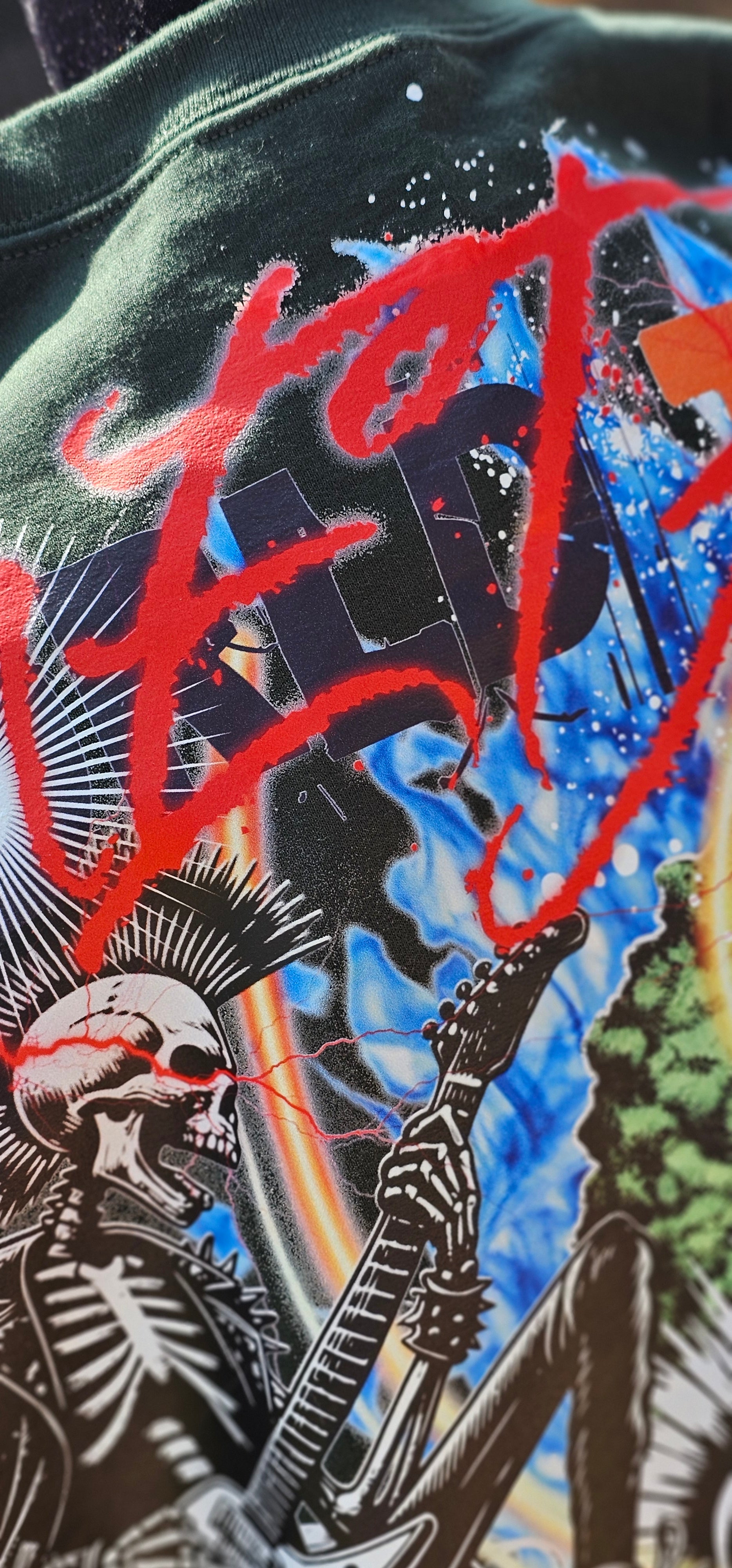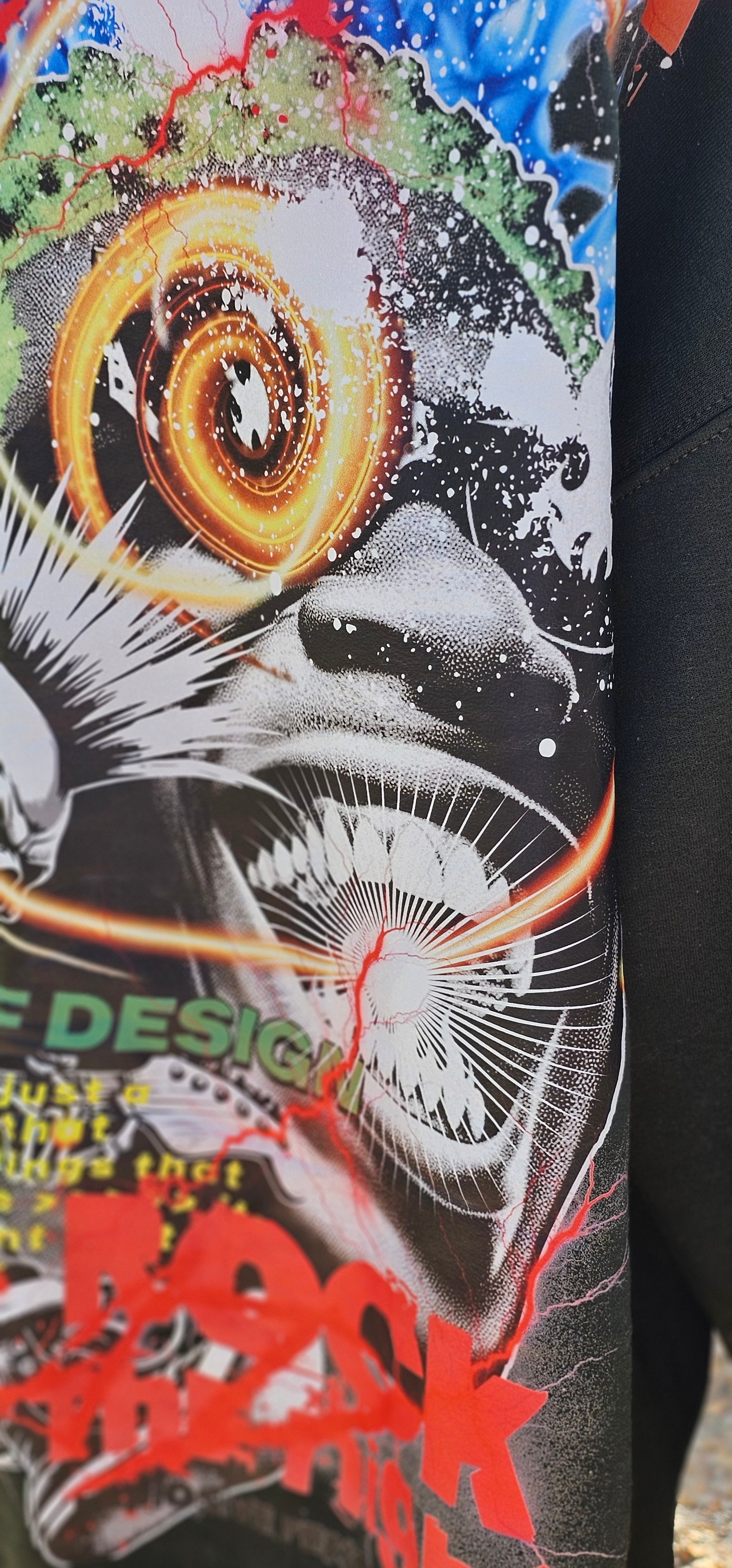Yo, check this out—Fractured Visage is straight-up diving into that shattered self vibe, all about the chaos in your head and the inner beef that's messin' with who you are, Brooklyn-style. It's rockin' wild, trippy visuals to rep those clashing vibes grindin' on your soul. That swirlin' spiral in the eye? That's your twisted view of the world, straight mental static. The gritty, mean-muggin' face and that bony figure? They hit on that raw tug-of-war between bein' exposed and ready to throw down. Fiery reds clashin' with earthy tones scream the fight between burnin' everything down and keepin' it grounded, while the stacked graffiti tags peel back layers of secret stories and that underground rebel fire bubblin' up. Slap this on as wearable art, and it's like wearin' your mask on the streets of BK, callin' out the pressures that crack your whole identity.