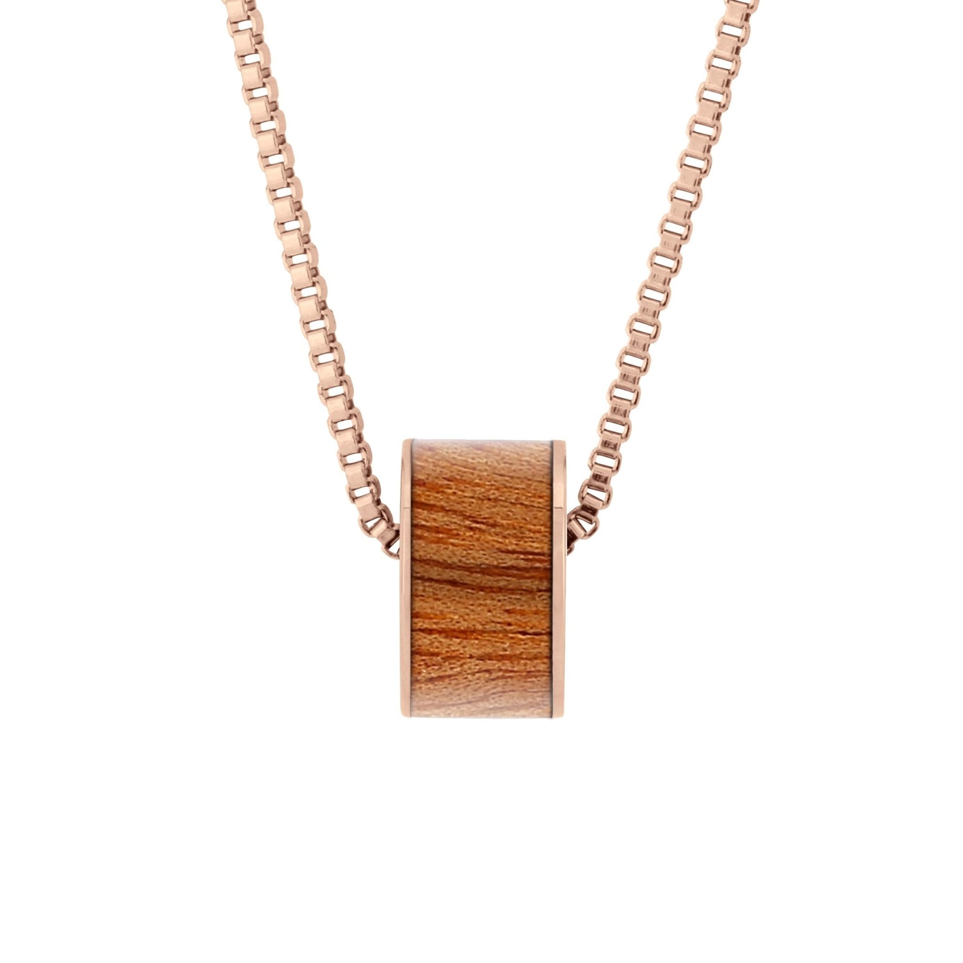 Rose Gold plated stainless steel barrel bead pendant inlaid with responsibly sourced Gum Burl (Tasmanian Oak/Stringybark) timber. Barrel bead also fits most popular charm bracelets.