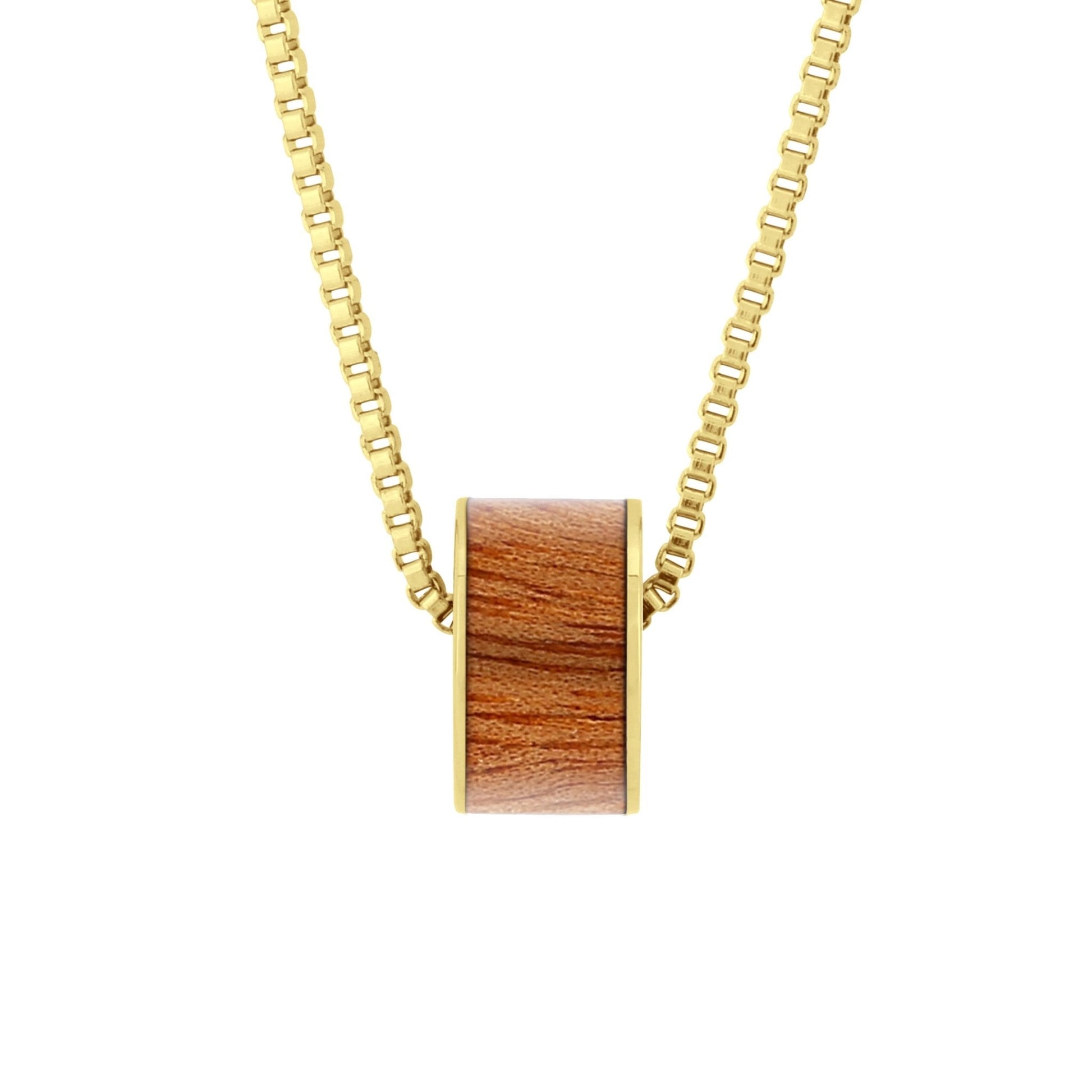 Yellow Gold plated stainless steel barrel bead pendant inlaid with responsibly sourced Gum Burl (Tasmanian Oak/Stringybark) timber. Barrel bead also fits most popular charm bracelets.