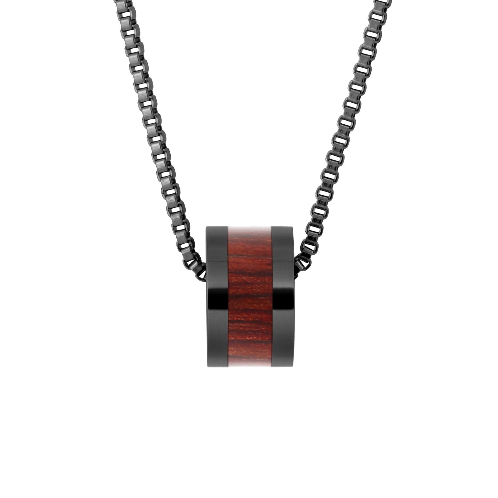 Gunmetal plated stainless steel barrel bead pendant inlaid with responsibly sourced Jarrah timber from southwest Australia.