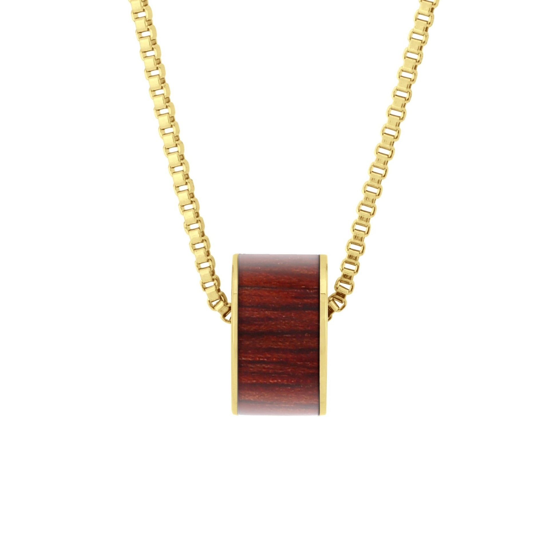 Yellow Gold plated stainless steel barrel bead pendant inlaid with responsibly sourced Jarrah timber from southwest Australia.