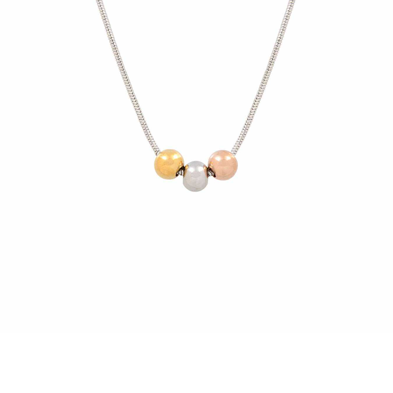 A delicate dance of light, movement, and color. Three polished 6mm globes—silver, gold, and rose gold—glide freely along the signature B.Tiff premium surgical stainless steel coil chain, allowing you to rearrange their order and create your own balanced composition. Whether aligned in harmony or playfully offset, the Triolette adapts to your every mood with effortless charm.