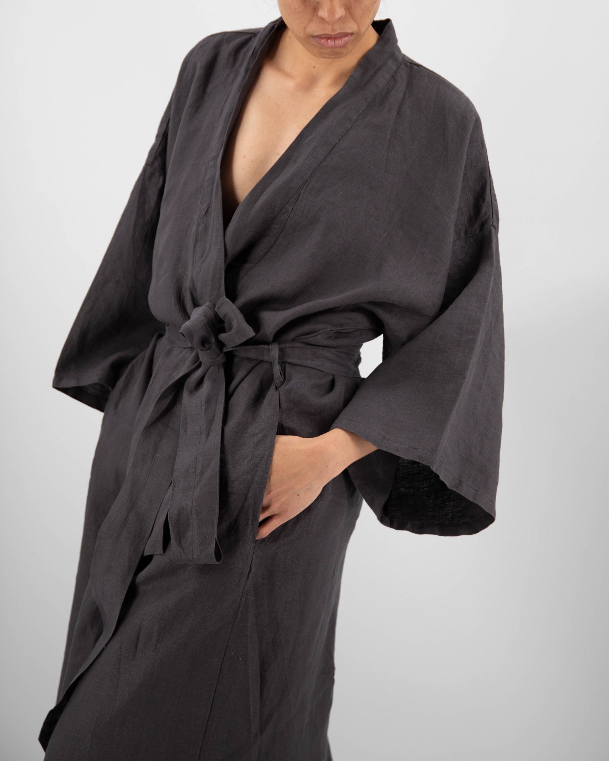 Our Linen Robe, comprised of French linen, is a Japanese-inspired, full length Kimono-style statement piece. The robe has hidden, low-hanging pockets on the side seams and is one size fits most (0-16).